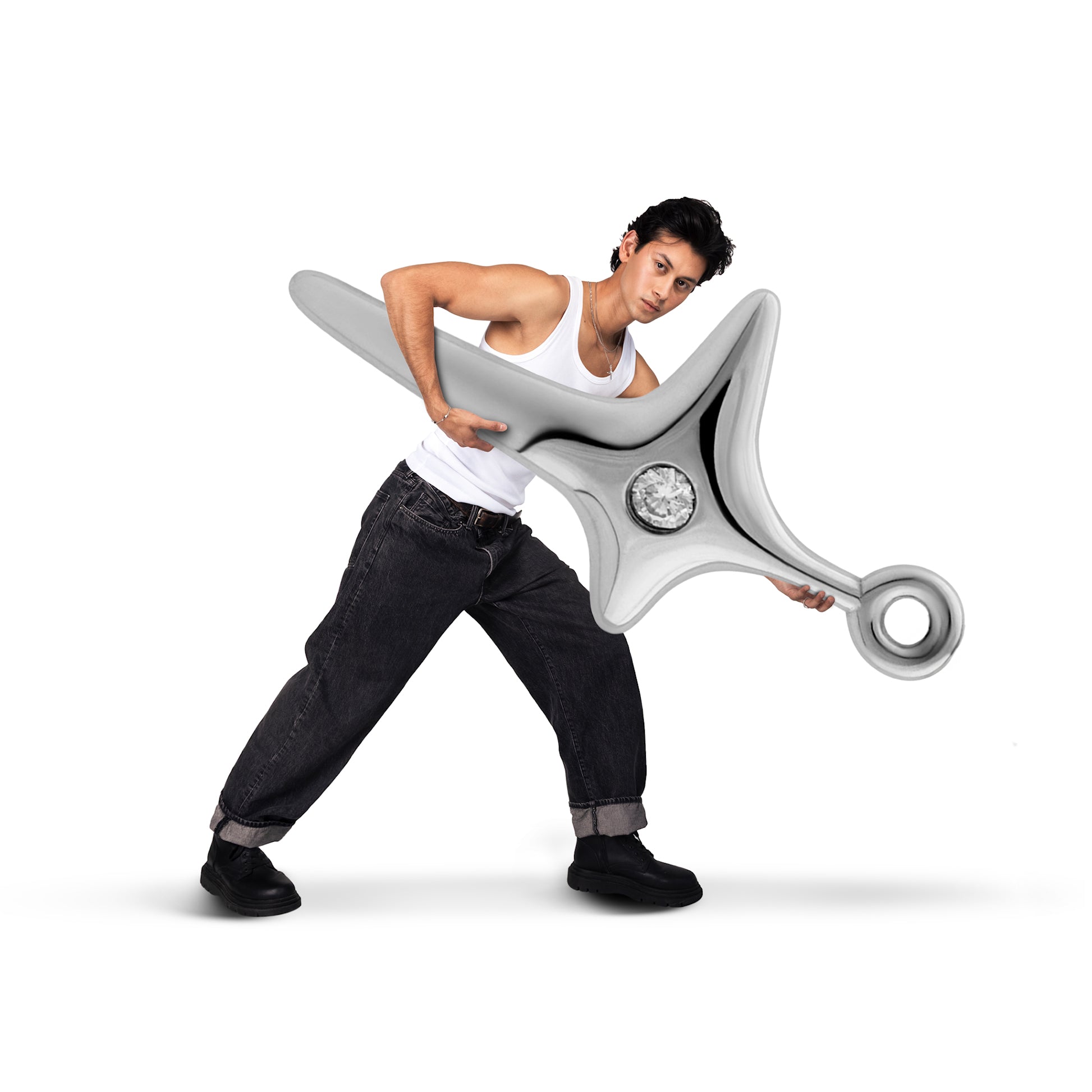 The Star Pendant returns in an updated form, reintroduced from the previous collection. Its mirrored surface is achieved through a thicker rhodium finish that reflects both wearer and world. Centered with a zircon stone and suspended on a 1.2mm snake chain, it embodies a refined balance of light and form.